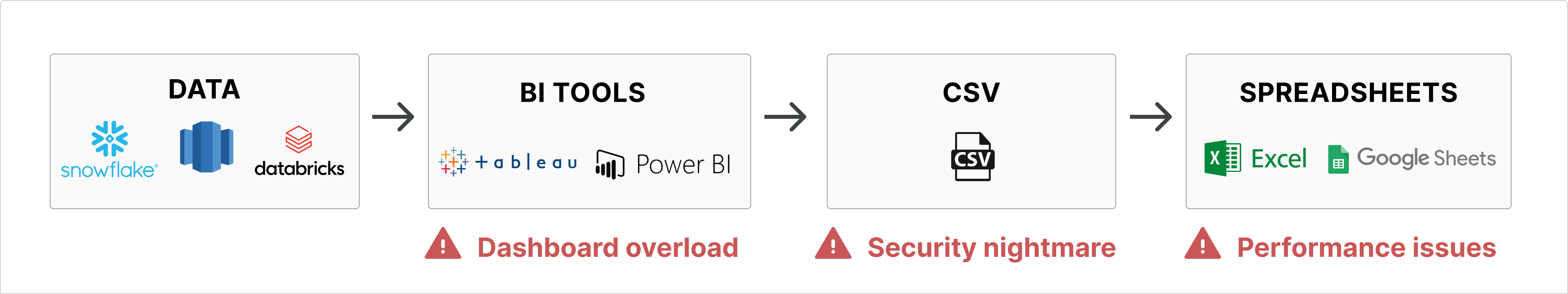 At most organizations, data teams build hundreds of dashboards and business teams export to CSV and work in spreadsheets. This leads to untraceable data leakage, competing sources of truth, and frustrated teams.
